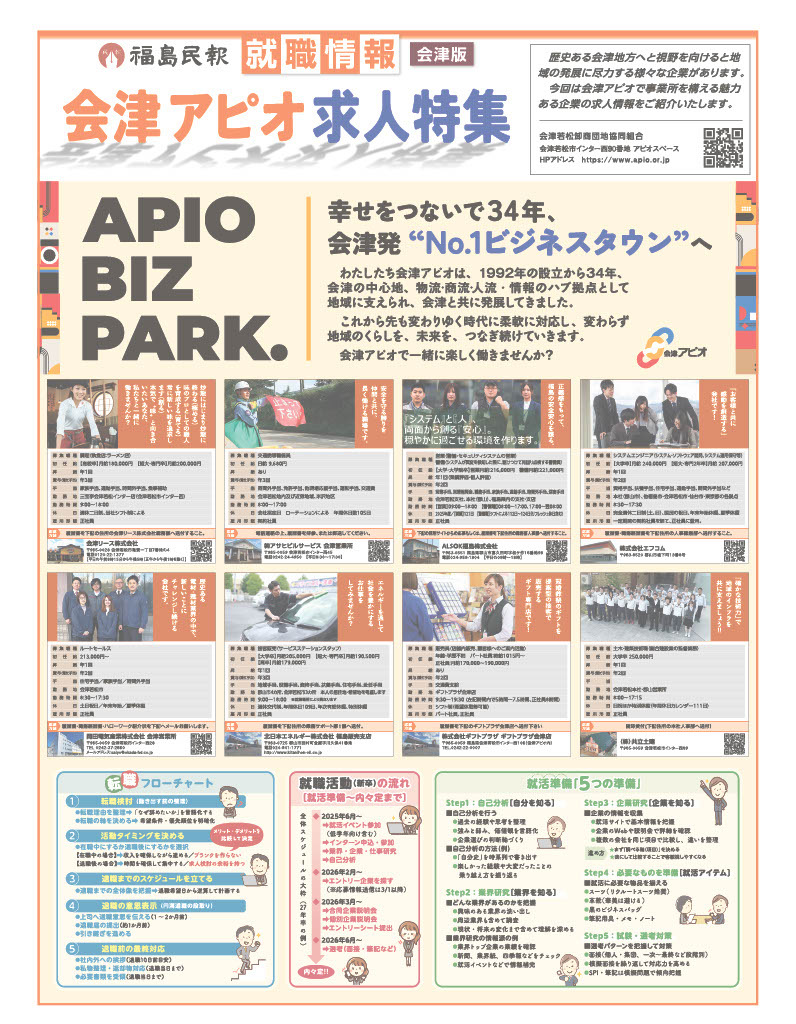 会津アピオ求人特集が発行されました。 投稿日: 2026年2月3日2026年2月3日 投稿者: 長嶺修 すでに、お目に掛けた方も多いかと思いますが、2026年2月1日の福島民報・福島民友に「会津アピオ求人特集」が掲載されました。今年は、25社の組合員企業の魅力的な求人情報が出ていますよ!みなさんの周りでお仕事をお探しの方に紹介していただけるとありがたいです。よろしくお願いします。 当HPのお知らせにも掲示しますが、以下にも載せておきます。ご活用ください!! (Visited 6 times, 1 visits today)